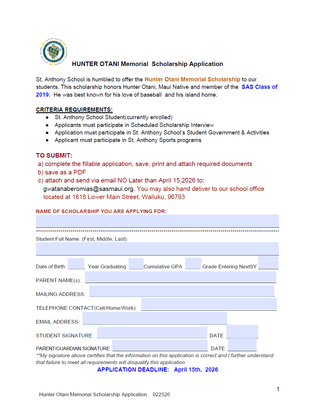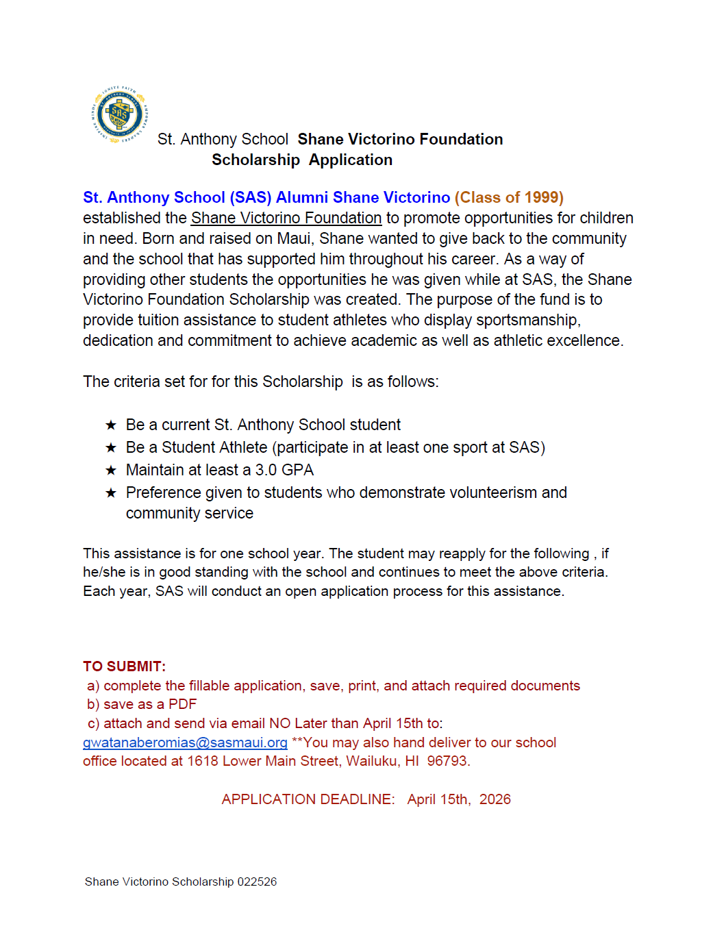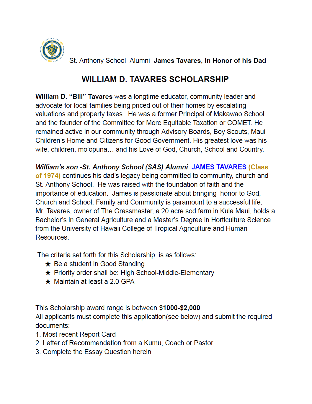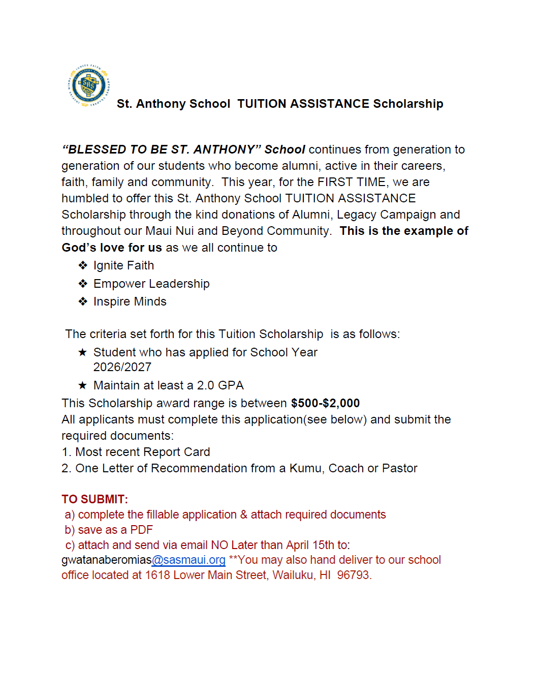 - Maui Catholic Student Tuition Assistance Fund (MCSTAF)